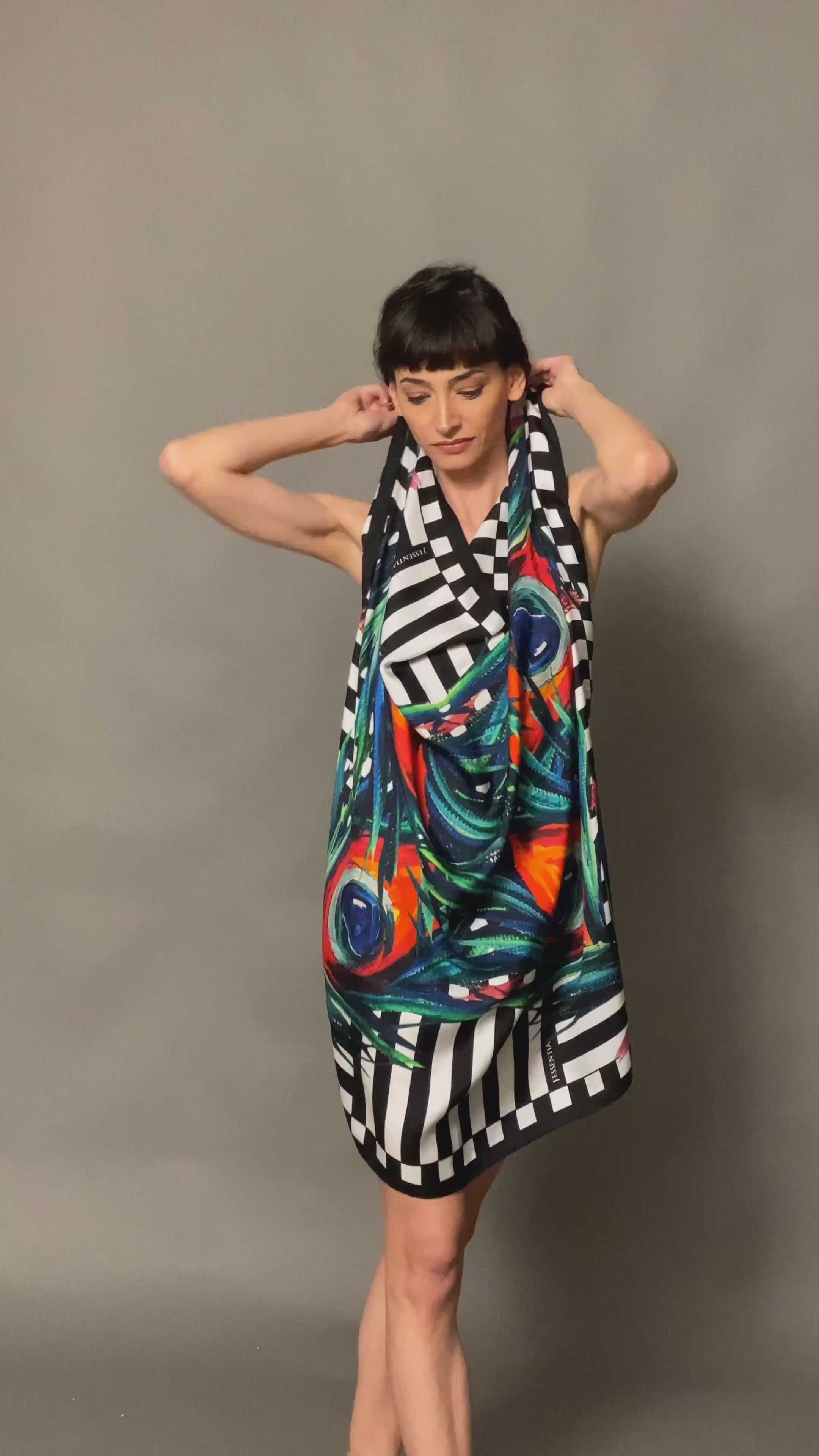 Dalla tela alla seta. I quadri d'arte della pluripremiata artista e designer Francesca Jennifer Puzzo si trasformano in foulard da collezione per una vera e propria trasposizione del concetto di Wearable Art, arte da indossare. Accessorio intramontabile del guardaroba, questo foulard è un must have per un regalo speciale o da indossare in una speciale serata o cerimonia.